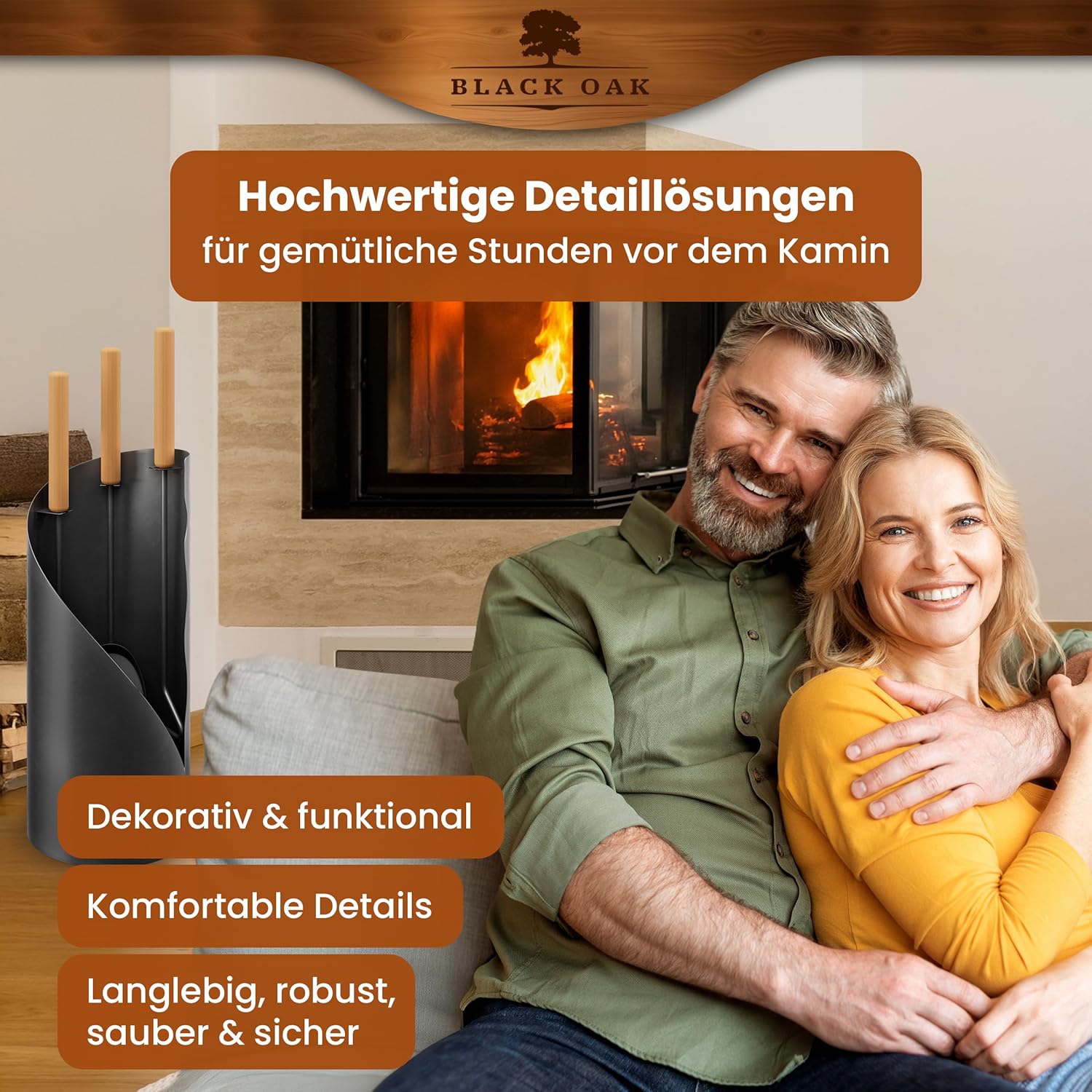 Das BLACK OAK “VAIL” Kaminbesteck kombiniert modernes, minimalistisches Design mit praktischer Funktion - stilvoll in mattem Schwarz mit ergonomischen Holzgriffen. Es sorgt für Ordnung am Feuer und ist ein echter Blickfang neben deinem Kamin oder Ofen.