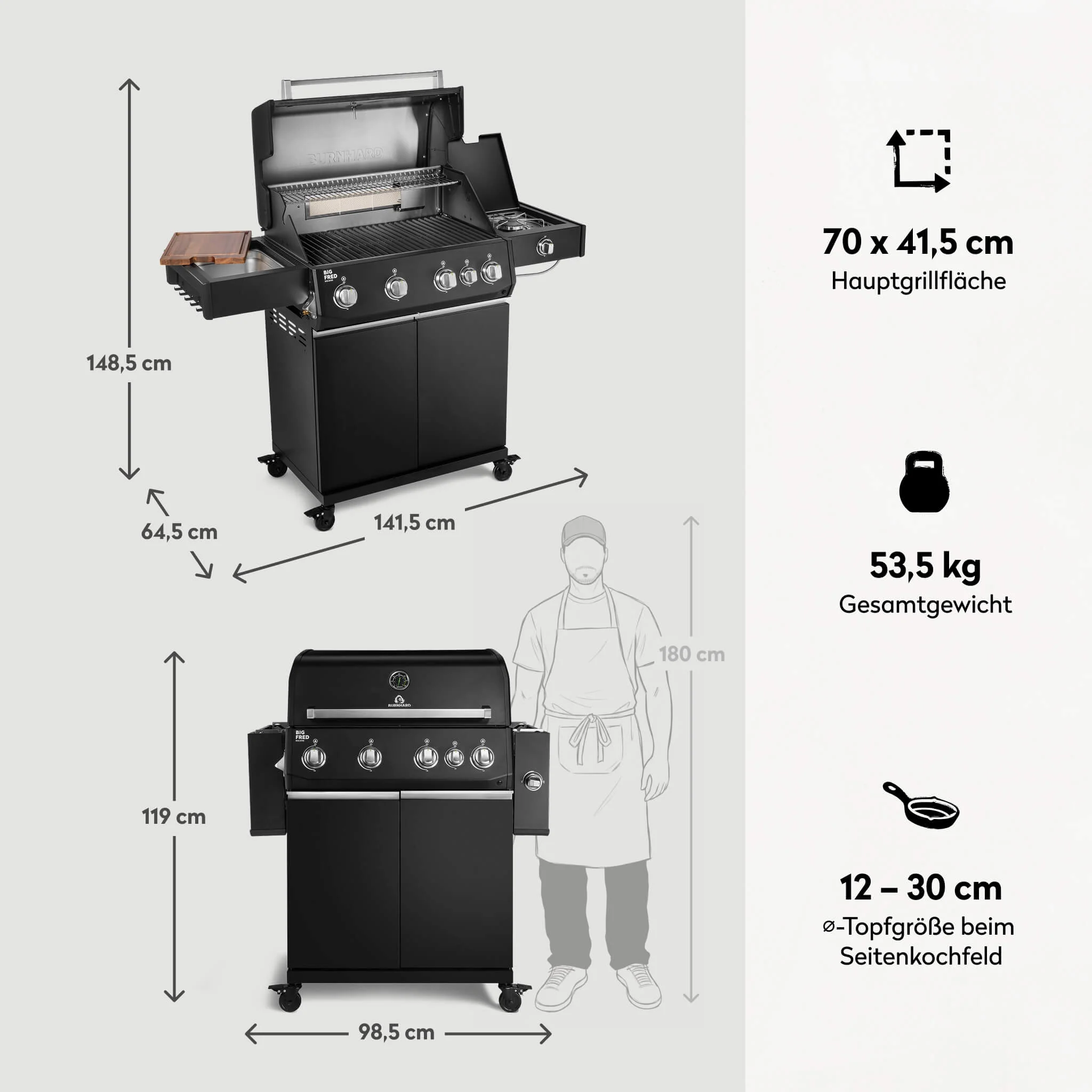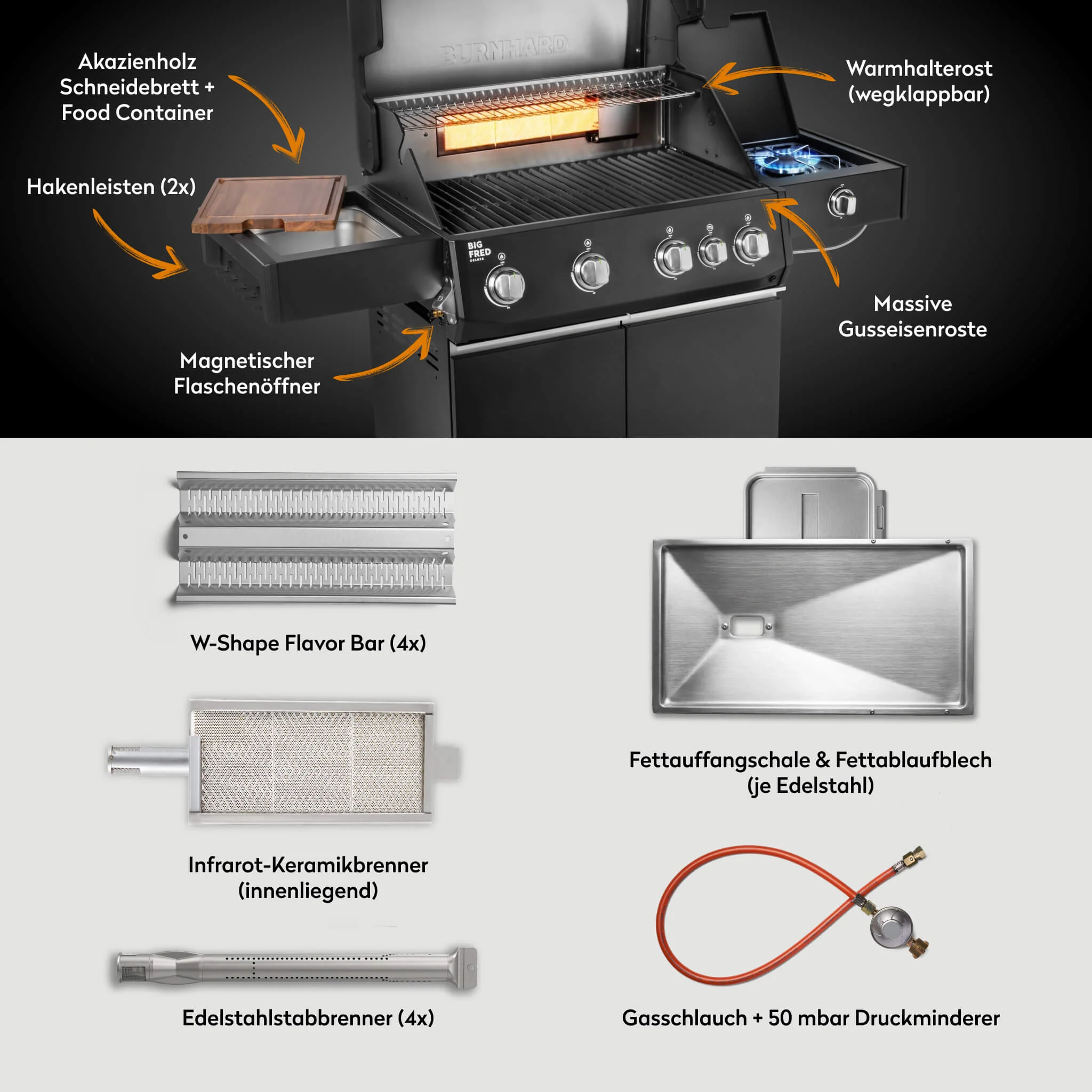 BURNHARD Big FRED Deluxe Gasgrill 4 Brenner Series 4 Black Edition mit Gusseisen Grillrost Maximale BBQ Power 21,2 kW Premium Ausstattung