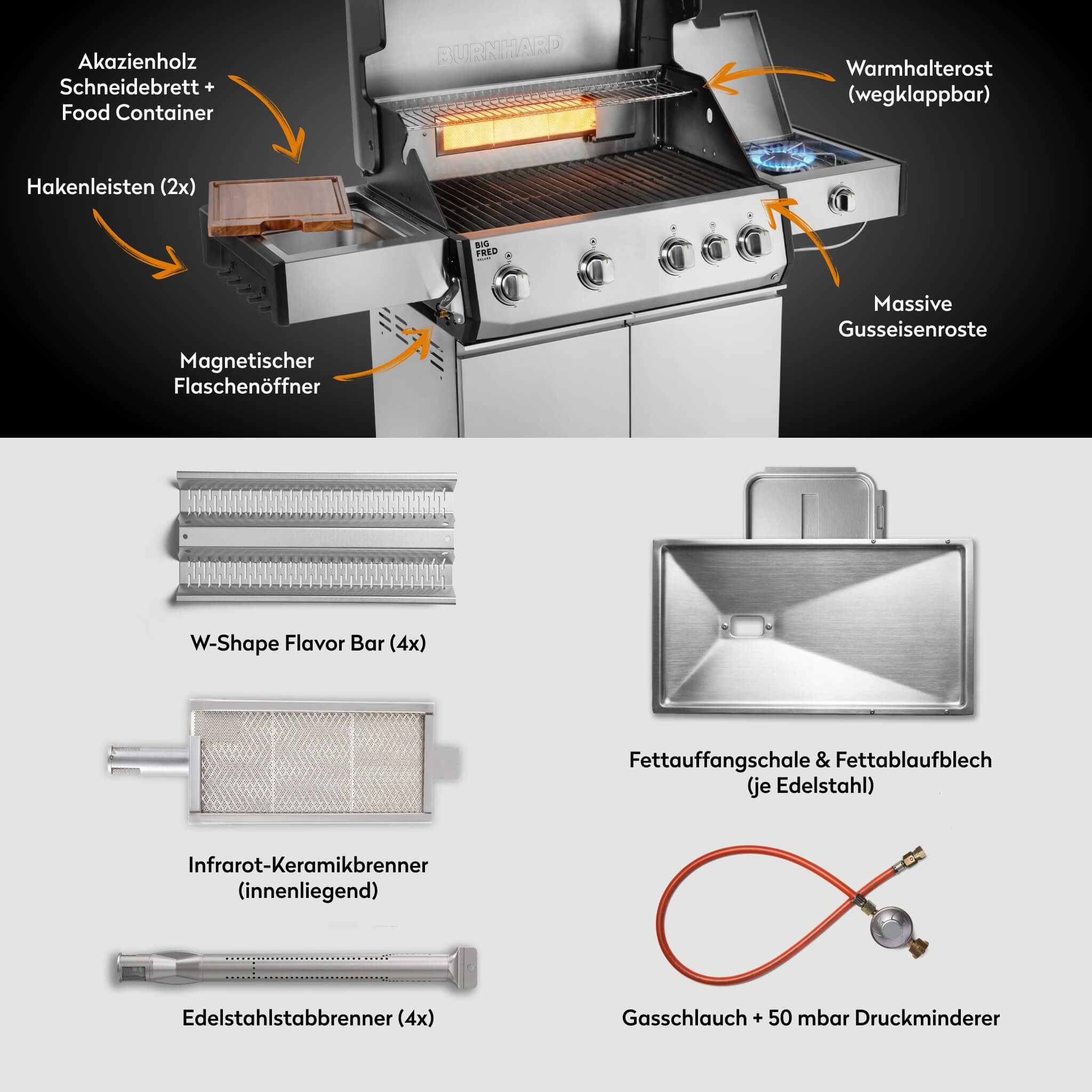 Produktinformationen "BURNHARD Big FRED Deluxe Gasgrill 4 Brenner Series 4 Edelstahl Grill mit Gusseisen Grillrost Maximale BBQ Power 21,2 kW Premium Ausstattung"