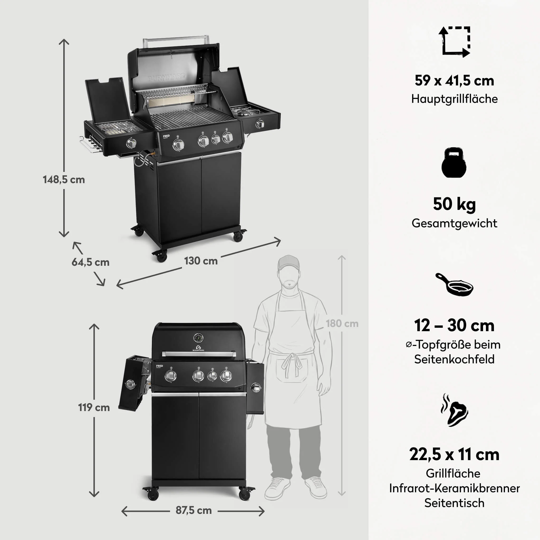 Der FRED Deluxe Plus bietet dir ein High End Setup aus drei Edelstahl Stabbrennern oder Longlife Premium Gussbrennern mit jeweils 3,75 kW, einem Infrarot Keramik Heckbrenner mit 3,2 kW, einem Seitentisch Infrarot Keramikbrenner mit 3,5 kW sowie einem Seitenkochfeld mit 3,0 kW. Mit dieser Gesamtleistung von 20,95 kW erreichst du maximale Hitze für jedes Grillvorhaben von scharfem Anbraten bis hin zu indirektem Garen und Rotisserie.