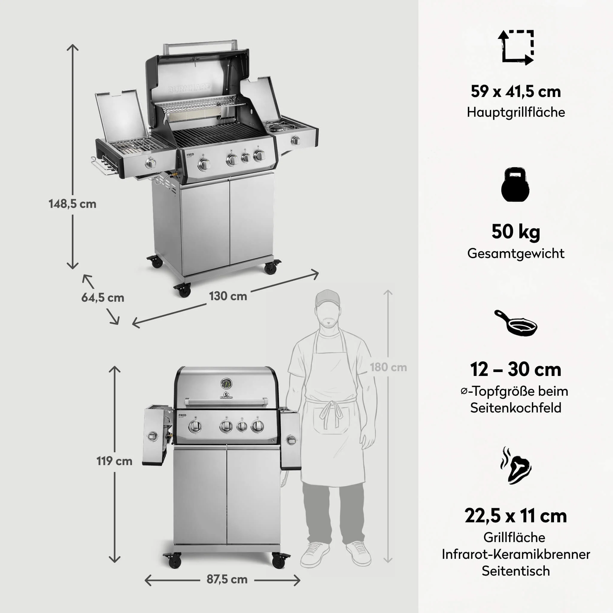 BURNHARD FRED Deluxe Plus Gasgrill 3 Brenner Series 4 Edelstahl Grill Maximale BBQ Power 20,95 kW Premium Ausstattung