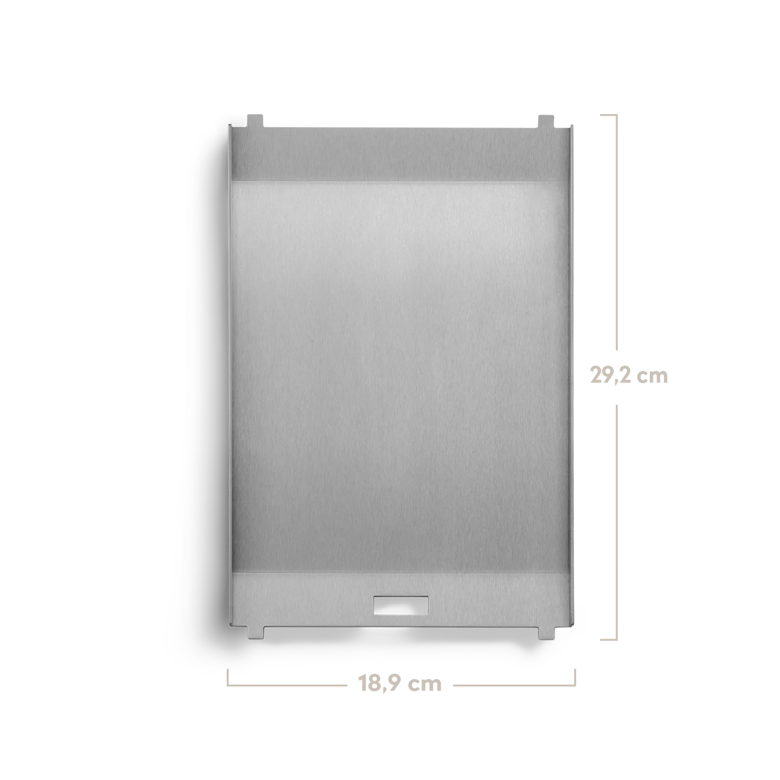 Der Edelstahl‑Schaber ist hitzebeständig, rostfrei und spülmaschinengeeignet - ideal zum Reinigen der glatten Plancha‑Oberfläche. Der Spachtel mit Griff liegt sicher in der Hand und verhindert Hitzebrände - die perfekte Kombination aus Form und Funktion.