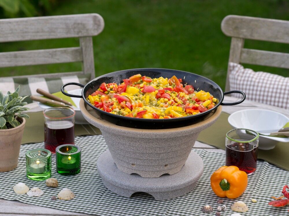BRATFEUER® - Der blitzschnelle Outdoor - Herd - BF Auf das Bratfeuer können Sie sich jederzeit verlassen. Als Brennstoff nutzen Sie unsere mitgelieferten Schnellbriketts oder Holzkohle & Holz. So bleiben Sie unabhängig von Strom und Gas. Kochen im Freien direkt auf dem Tisch Gesundheitsbewußt braten mit Grill-Feeling Gesellig, denn der Koch sitzt am Tisch Schnell und einfach zu betreiben Sofort loslegen, Komplettpaket mit 2 x Schnellbriketts Für Balkon, Terrasse oder Garten Mit Schnellbriketts, Holzkohle oder Holz zu beheizen Wärmespeichernd und daher sparsam im Brennstoffverbrauch Mit Rezeptheft Umfangreiches Zubehör Made in Germany Kultur der Geselligkeit Das Essen auf dem Feuer und alle nehmen drumherum Platz. Was für eine heimelige und gesellige Atmosphäre! Die Köchin (oder der Koch) führt Regie – aber nicht wie sonst alleine am Herd, sondern mittendrin im Geschehen. Die Zubereitung köstlicher Speisen als gemeinsamer Genuss. Ganz gleich, ob Sie braten, dünsten oder grillen: Dieser Schmaus im Kreise Ihrer Liebsten avanciert zu einem kulinarischen Fest, das nach Wiederholung ruft. Schnell und einfach Das Bratfeuer lässt sich ganz einfach bedienen. Als Brennstoff verwenden Sie unsere Schnellbriketts, Holzkohle oder Holz. Das Feuer haben Sie im Handumdrehen angezündet, ein leichter Luftzug entfacht die Glut. Dann Pfanne aufsetzen und das Bratvergnügen nimmt seinen Lauf. Wärmespeichernd und sparsam im Brennstoffverbrauch Das Bratfeuer fertigen wir aus hochwertiger CeraFlam®-Keramik. Außen haben wir es zusätzlich mit Granicium® beschichtet. Diese Materialkombination macht Ihr Bratfeuer robust und langlebig. Die Keramik speichert zusätzlich die Wärme, was den Verbrauch an Brennmaterial reduziert. Darüber hinaus dient das Bratfeuer als Heizgerät und bringt Behaglichkeit in die abendliche Runde. Überall einsetzbar Ihr Bratfeuer braucht den freien Himmel. Es liebt den Balkon genauso wie die Terrasse oder den Garten. Platzieren Sie es ganz einfach mitten auf dem Tisch. Auch auf einem Beistelltisch haben Sie Ihr Bratfeuer immer in Reichweite. Oder verwenden Sie den eleganten Ständer aus Edelstahl*. Ihr Bratfeuer besitzt einen großen Aktionsradius. Es begleitet Sie zum Picknick, zum Campen oder an den Strand. Ihren Outdoor- Herd haben Sie immer dabei. *Zusatzausstattung Braten mit Deckel Nutzen Sie den kostenlos mitgelieferten Deckel zum Garen von Gemüse, zum Braten von Fisch oder auch beim Anbraten von Fleisch. Auch wenn er ganz einfach in der Ausführung ist, überzeugt er doch durch seine Nützlichkeit und Zweckmäßigkeit. Die große Oberfläche der Pfanne gibt sehr viel Wärme ab. Der Deckel aus leichtem Aluminium hält die Hitze in der Pfanne und erweitert dadurch den Einsatzbereich des Bratfeuer immens. Sie werden Ihre Freude damit haben. Bitte beachten Sie aber, dass der Deckel nicht auf der Grillpfanne mit direktem Feuerkontakt verwendet werden darf. Praktisches Zubehör Als optionales Zubehör empfiehlt sich ein Ständer aus Edelstahl. Damit steht das Bratfeuer platzsparend am Tisch und kann sitzend bedient werden. Weiterhin bieten wir einen passenden Untersatz für brennbare und hitzeempfindliche Stellplätze an. Zum Grillen mit direktem Feuerkontakt gibt es eine Grillpfanne aus Edelstahl mit klappbarem Griff. Außerdem können Sie die schon im Lieferumfang enthaltenen Schnellbriketts sowie zusätzliche Pfannen nachbestellen. Grillfeeling ohne Nebenwirkungen Bleiben Sie gesundheitsbewusst! Bei der Zubereitung auf dem Bratfeuer haben Fleisch und Wurst keinen direkten Feuerkontakt. Trotzdem breitet sich ein köstlicher Grillduft aus. Mit Ihrem Bratfeuer zaubern Sie noch viel mehr auf den Tisch. In der emaillierten Pfanne gelingen Ihnen Forelle & Co. Ebenso gut wie Gemüse, Paella oder Pfannkuchen. Bleibt nur noch die Frage: Welches Gericht passt zu welchem Gast? Material: Hergestellt aus CeraFlam® Keramik Außenseite zusätzlich mit Granicium® beschichtet Gebrannt im offenen Gasbrand Maße: Ø 35 cm, Höhe: 16 cm (mit Pfanne 19 cm), Gewicht: 6,5 kg Lieferumfang: Bratfeuer, Schale CeraFlam® mit Granicium® beschichtet, Bratpfanne Aluminiumdeckel Edelstahl-Ascherost 2 x Schnellbriketts Anleitung & Rezeptheft Deko, Untersatz und Ständer für das Bratfeuer nicht im Lieferumfang