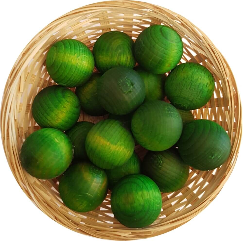Duftholz Minze Unsere original spanischen Dufthölzer sind von höchster Qualität aus Buchenholz und werden in einem speziellen Verfahren in hochwertigen Ölen getränkt und danach mit ungiftigen Farben farblich abgestimmt. Sie werden in Form der entsprechenden Frucht oder als Kugel geliefert. Sie halten durch ein spezielles Herstellungsverfahren sehr lange ihren Duft. Wir empfehlen die Dufthölzer von Zeit zu Zeit geringfügig mit Wasser zu besprühen. Arrangieren Sie die Hölzer frei nach Ihrer Fantasie mit z.B. Potpourri, Blättern oder einfach nur so in einer Schale. Technische Daten: Herkunft: Spanien Duftnote: Minze Holz: Buchenholz Form: Kugelform Farbe: grün Liefermenge: 25x Minze Duftholz Größe: ca. 37 - 40mm Die Bambusschale ist nicht im Lieferumfang enthalten und dient nur der Dekoration. Es besteht auch die Möglichkeit unsere Dufthölzer mit Duftölen nach zu beduften. Beachten Sie jedoch unbedingt folgendes: Verwenden Sie die Hölzer nie ohne einen geeigneten Untersatz, wie z.B. eine Schale aus Glas oder Keramik oder ein Körbchen, die Duftkugeln sind in hochwertigen Ölen getränkt und können sonst das Mobiliar angreifen. Wichtige Information: Denken Sie bitte daran, auch wenn die Hölzer schön bunt aussehen, gehören Sie keinesfalls in Kinderhände und erfüllen nicht den Zweck eines Spielzeuges. Qualitätsduftholz in Euro-Norm, keine Verschluckungsgefahr für Kleinkinder.