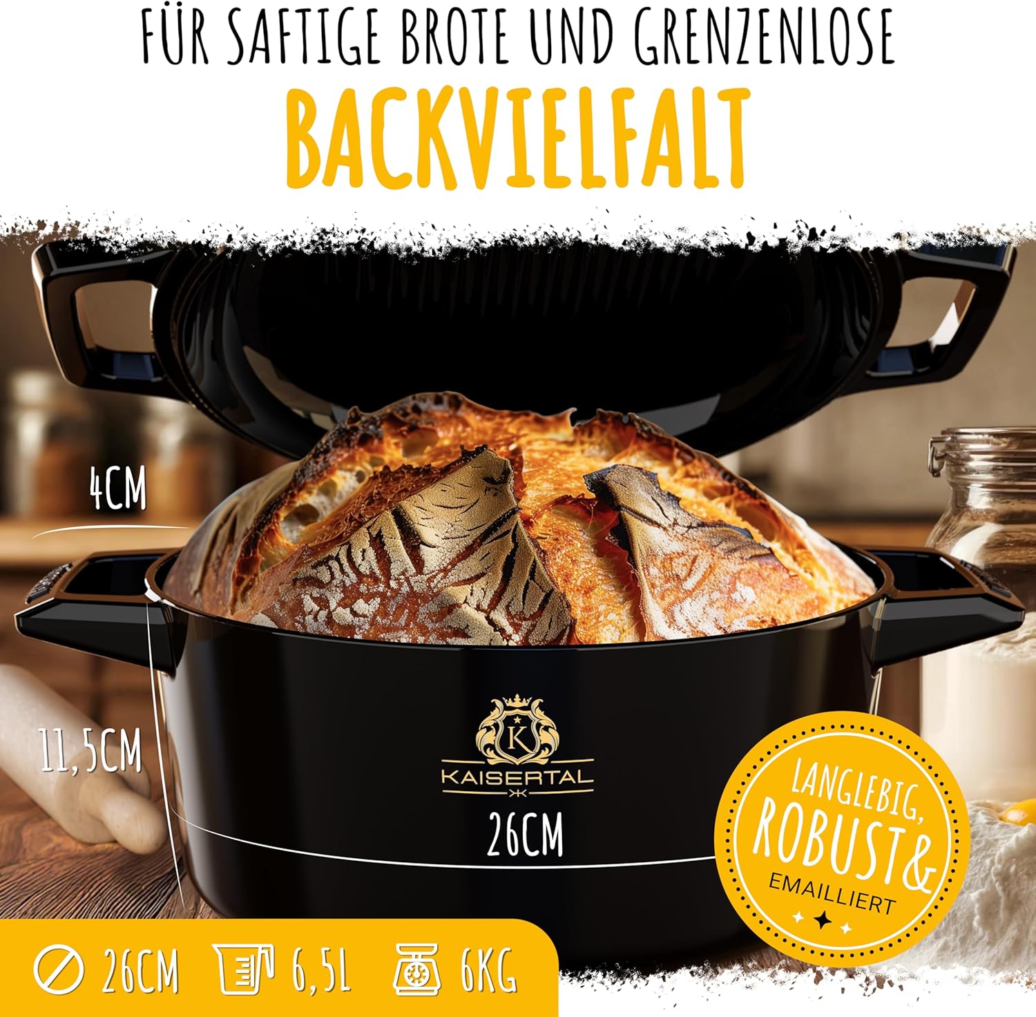 Mit der KAISERTAL Brotbackform emailliert mit Gärkorb backst du dein Lieblingsbrot ganz ohne Bäckerei. Die 26 cm große Gusseisenform bietet optimale Hitzeverteilung für gleichmäßige Kruste und saftiges Inneres. Perfekt für Sauerteig, Weizen- oder Dinkelbrot - in deiner eigenen Küche.