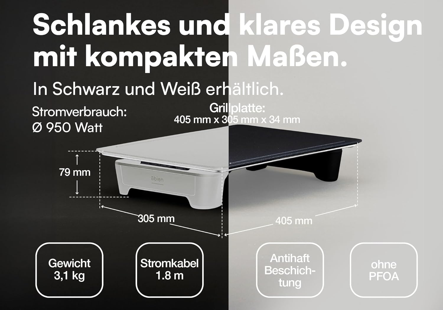 Der abien MAGIC GRILL ist eine ausgeklügelte Fusion modernster japanischer Technologie und edlem, minimalistischen Design. Im Inneren sorgt eine spezielle Polymerschichtheizung in Verbindung mit integrierter Sensorik für eine gleichmäßige Wärmeverteilung auf der gesamten Fläche und erreicht in vier Stufen Temperaturen von bis zu 250 °C – dabei wird nur die halbe Energie verbraucht, die herkömmliche Elektrogrills benötigen.